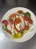 Crisp lettuce, cucumbers, tomatoes, green peppers, onions, Genoa salami, ham, pepperoni, provolone cheese, Greek olives, pepperoncini peppers and choice of dressing.